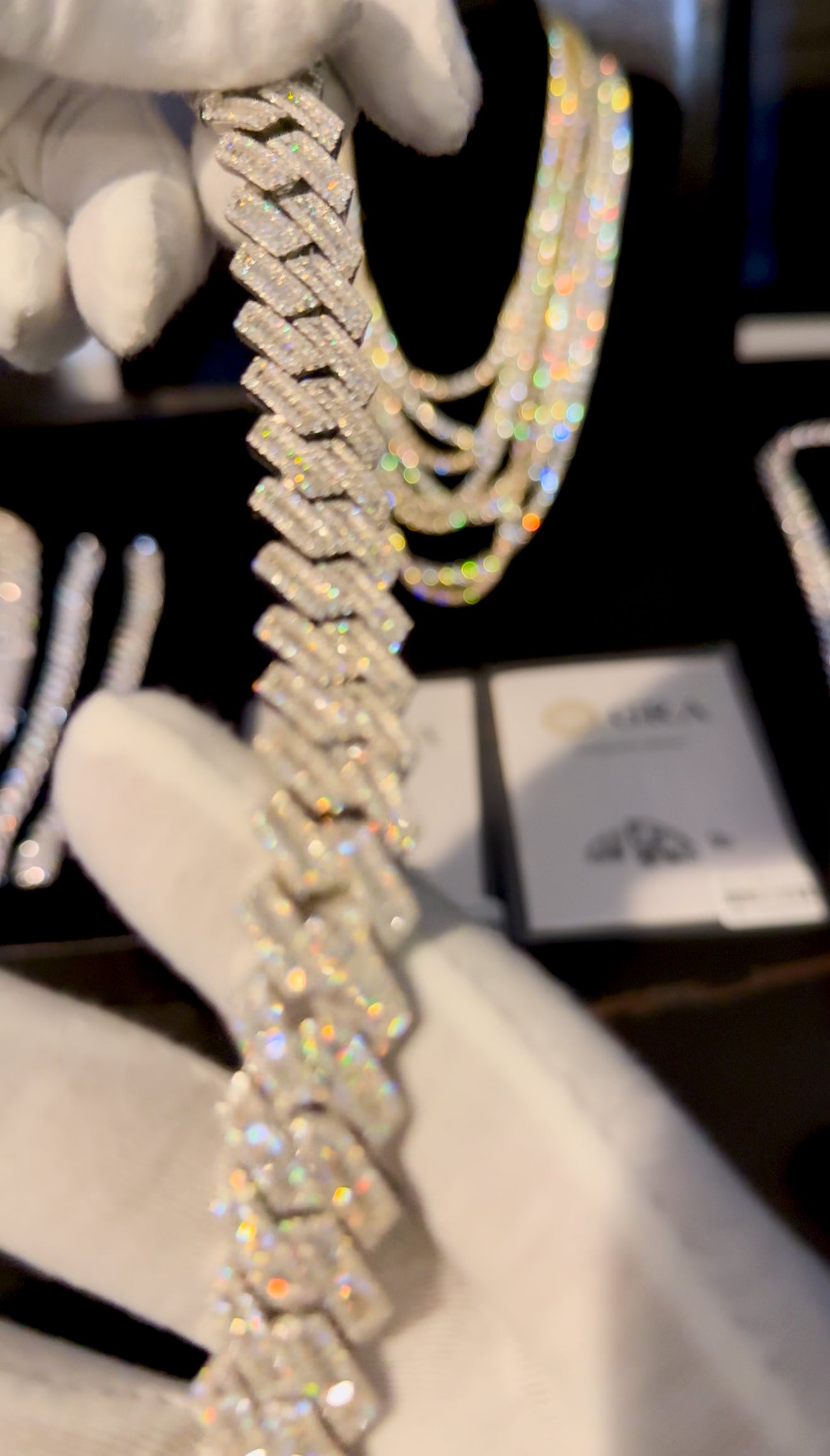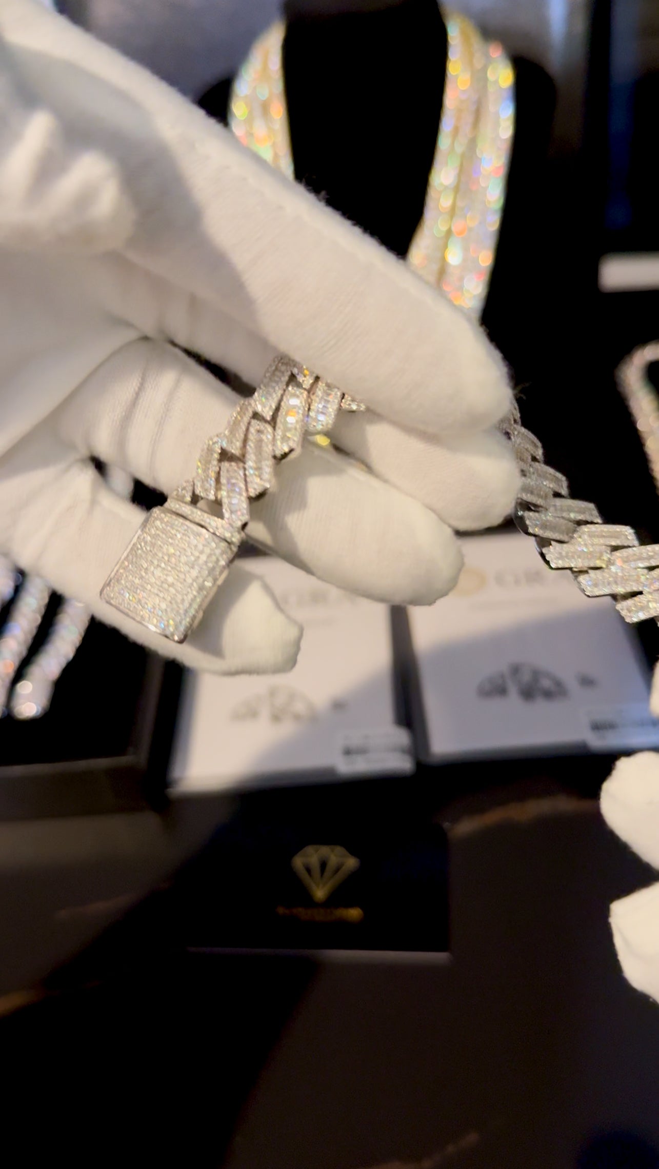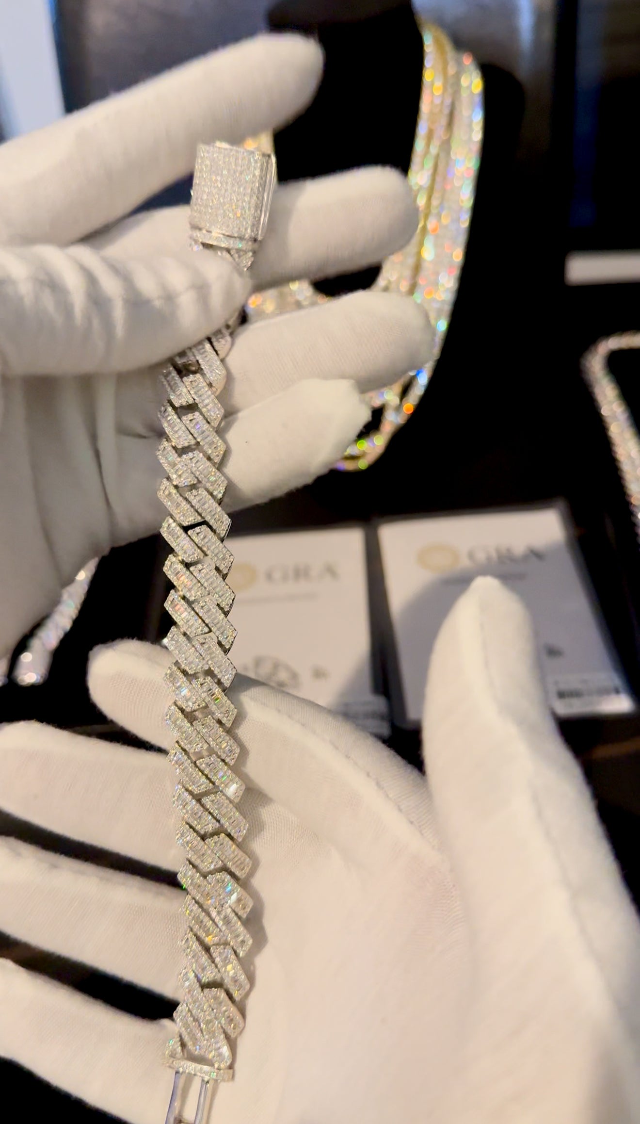 16mm sterling silver iced out Cuban bracelet. GRA certified VVS moissanite baguettes 8in. Passes diamond tester, lifetime warranty.